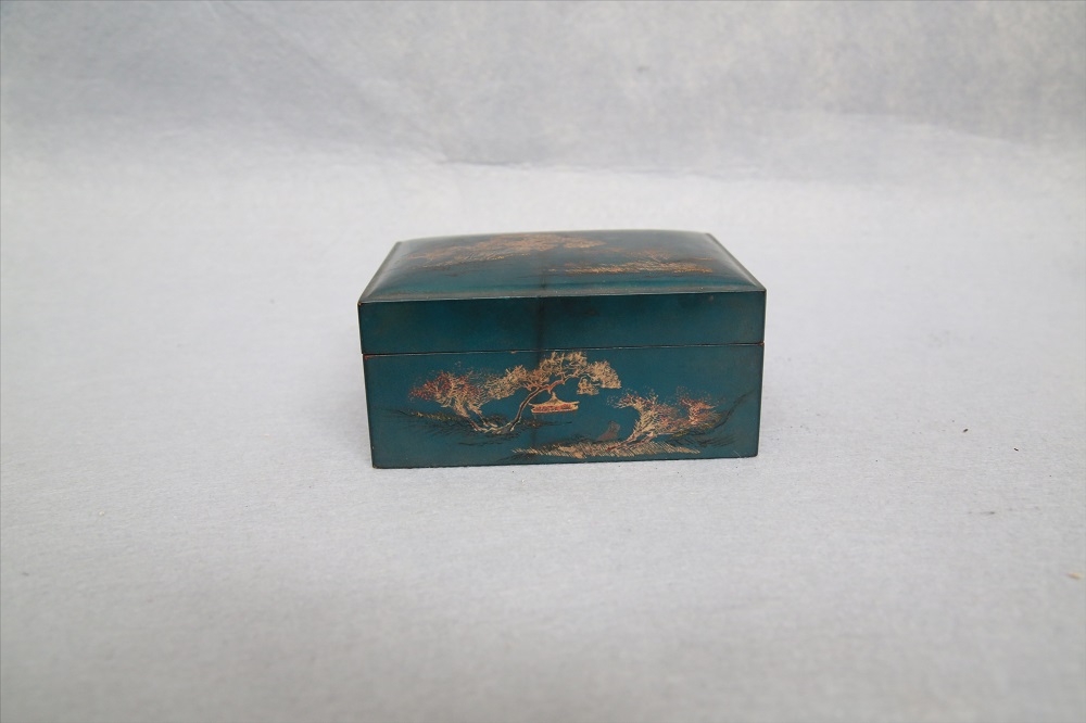 中华民国绿漆描金茶叶盒,藏品总登记号:2011-113,年代:中华民国,质地:木,尺寸:长13cm,宽10cm,高7.5cm,保存状态:状态稳定,不需修复