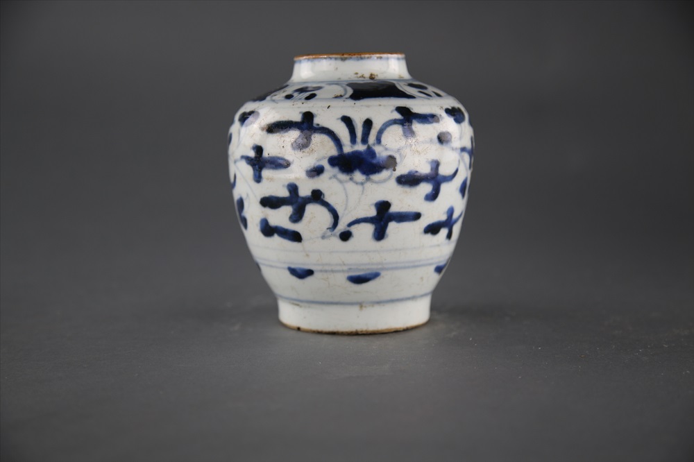 明树叶款青花瓷罐,藏品总登记号13862-1,年代:明,质地:瓷,尺寸:口径6.5cm,底径9cm,保存状态:状态稳定,不需修复