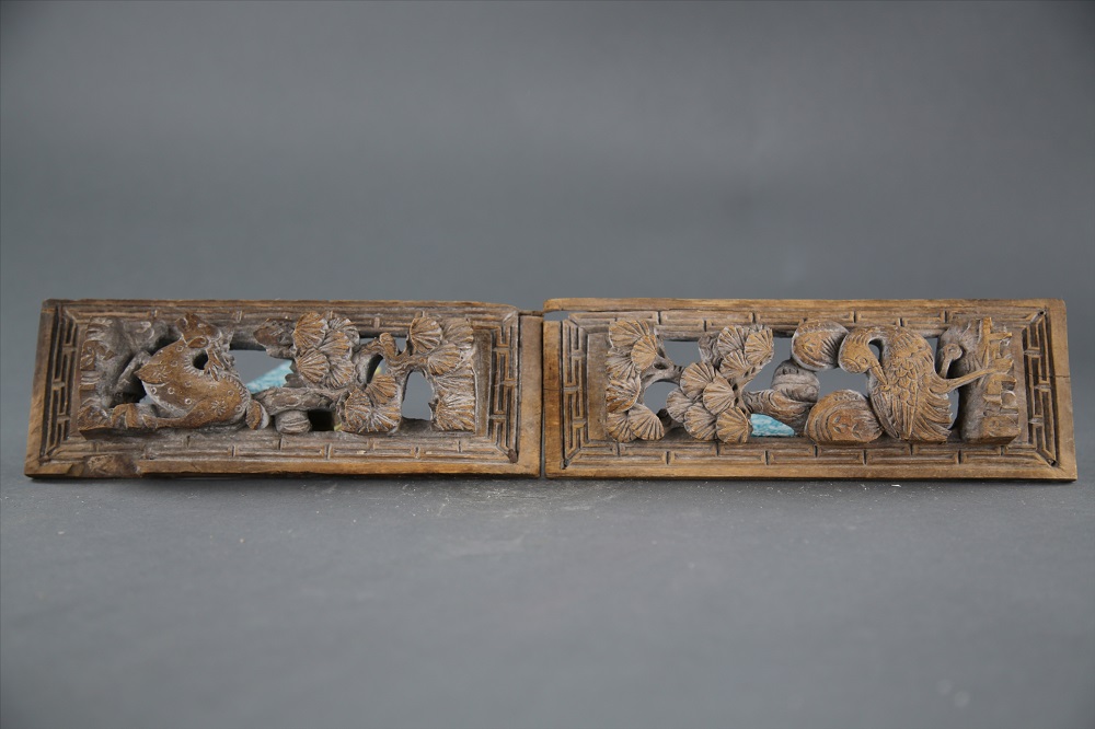 清松鹿鹤纹小雕板,藏品总登记号:2001-7,年代:清,质地:木,尺寸:长24.2cm,宽8.5cm,保存状态:部分损腐,需要修复
