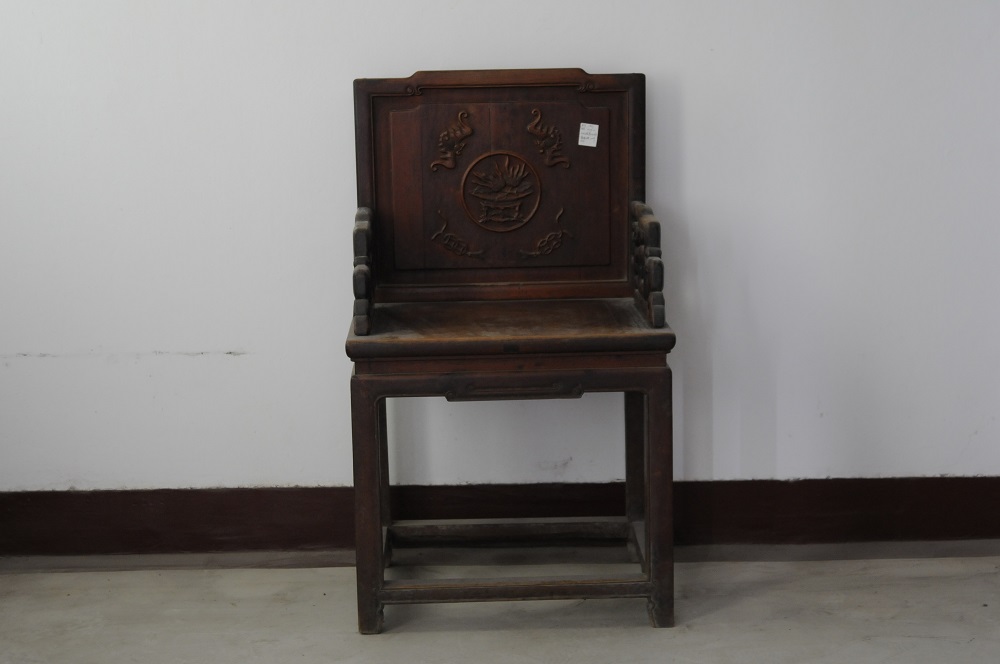 清白木福寿双钱太师椅,藏品总登记号:2005-2,年代:清,质地:木,尺寸:长44cm, 宽57cm,高98cm,保存状态:状态稳定,不需修复