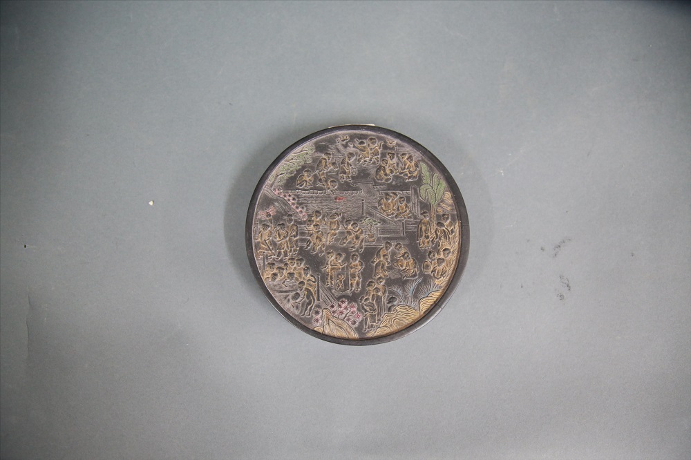 圆形山水人物墨,藏品总登记号:2010-36(25),年代:不详,质地,其他有机质,尺寸:直径14.5cm,高2.5cm,保存状态:状态稳定,不需修复