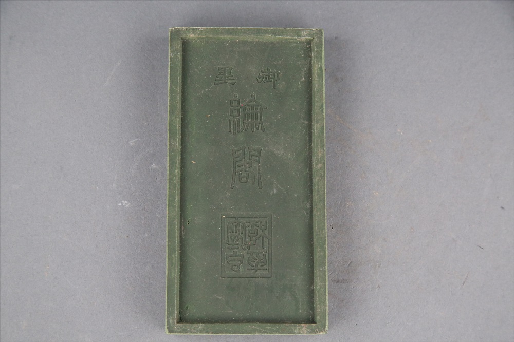 长方形山水绿色伦阁御墨,藏品总登记号:2010-36(30),年代:不详,质地:其他有机质,尺寸:长8cm,宽15.5cm,高1.5cm,保存状态:状态稳定,不需修复